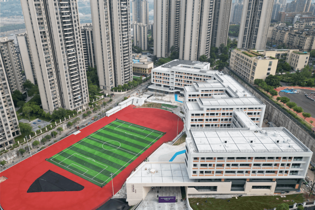 校园里,最引人注目的是悬空而建的足球场,在架空层上铺设的跑道,既消解了地形限制,又为孩子们创造了“空中运动乐园”。足球场下方建设篮球场和游泳馆,在充分利用空间的同时,让学生在风雨天也能享受运动乐趣。